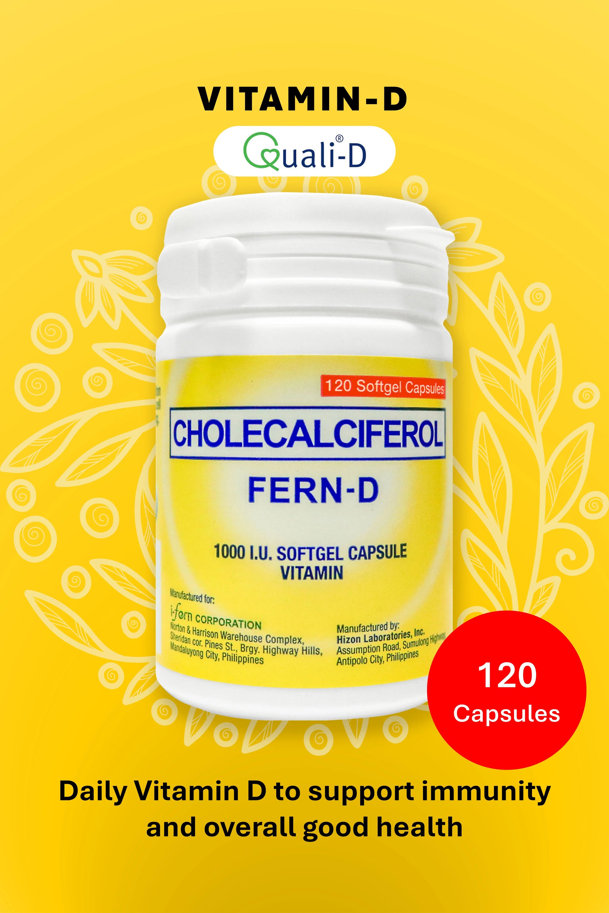 Fern-D is a Vitamin D₃ (cholecalciferol) supplement that helps maintain healthy levels of vitamin D in the body. Each softgel contains 1,000 IU of cholecalciferol, sourced from DSM Switzerland, a recognized global supplier of high-quality vitamins.